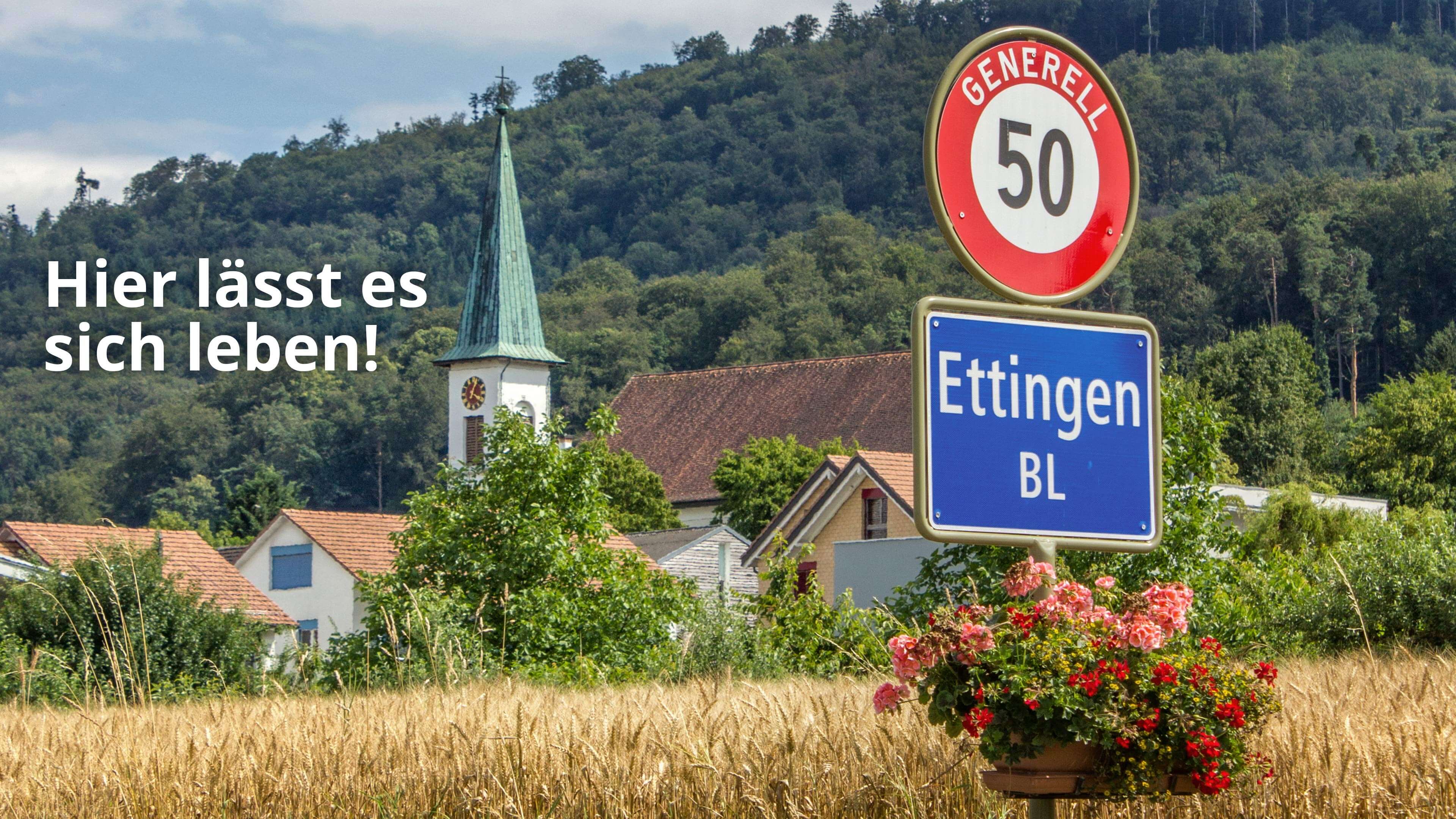 Hier in Ettingen (Slogan: «Ein grünes Dorf am Fuss des Blauen») wohnen Sie im Grünen und profitieren dennoch von den Vorzügen einer guten Infrastruktur und zentralen Lage. Die Gemeinde befindet sich am westlichen Rand des Kantons Baselland, nur einen Steinwurf entfernt von Ihren französischen Nachbarn.